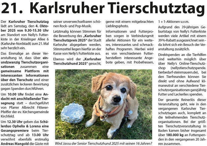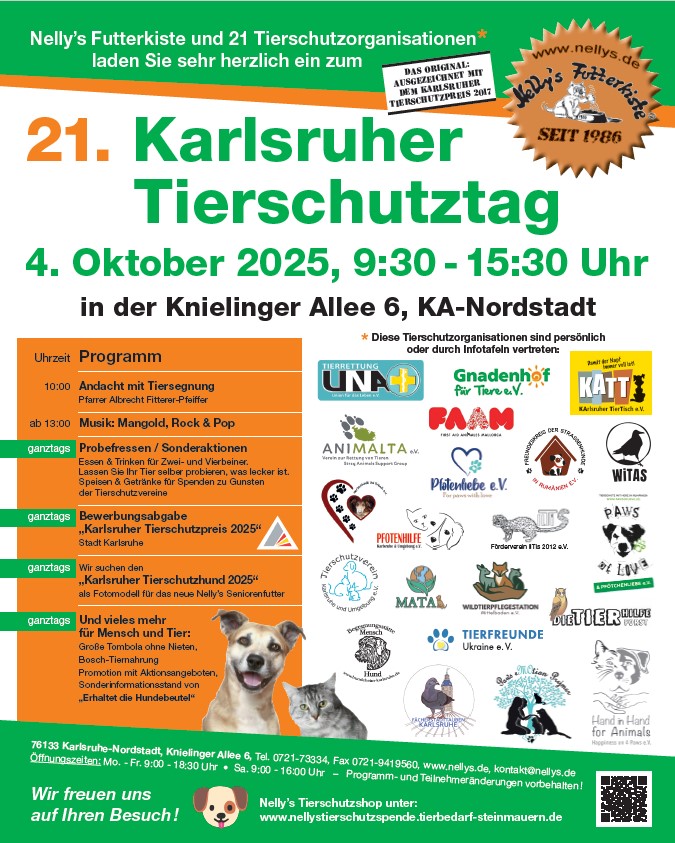 Übrigens: Am kommenden Samstag, den 4. Oktober, geht es weiter mit dem Karlsruher Tierschutztag!
